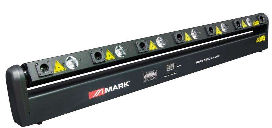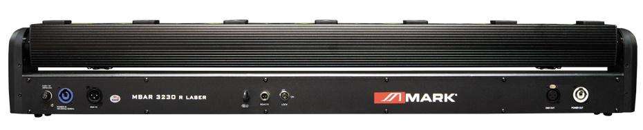 La MBAR 3230 R LASER es una barra de iluminación que incorpora 6 LEDs de 3W de color blanco cálido (3200 ºK) y 7 láseres de color rojo. La interfaz de configuración cuenta con una pantalla que muestra toda la información y botones para navegar por los menús, permitiendo seleccionar parámetros como los 9 programas de LED y los 8 de láser, que pueden ejecutarse automáticamente o mediante audio. Incluye el control del movimiento de la barra en su eje TILT y modo DMX (6/7/16/18/21 canales) con nivel de atenuación individual de cada LED o láser, y la activación de los programas tanto automáticos como de audio. Su base permite ubicar la barra en paredes, techos o incluso en el suelo, y dirigir el haz al lugar deseado aprovechando los 7° de ángulo de apertura.